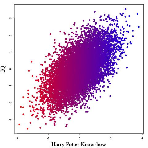 Let's say we're at an uber geek convention where SAS, R, and Matlab users alike meet to…er…mingle and speak of common interests. Being the research-minded student you are, you decide to measure three traits of the convention participants: how many friends they have (okay, I know you can't have negative friends and you can't have a fraction of a friend. Stop being so critical!), how much they know about R, and which club they belong to–the Mat Black Labs or the R-R-Us(es). You then plot the relationship betwixt the two quantitative traits: